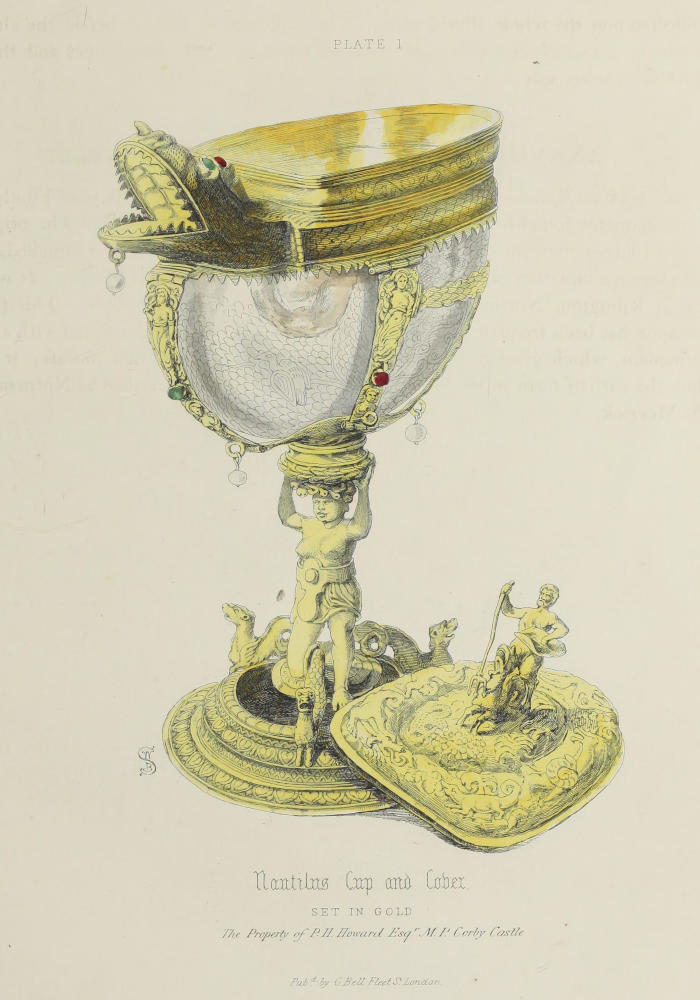 This is a beautiful specimen of cinque-cento goldsmith work, preserved at Corby Castle, the seat of H. P. Howard, Esq. M. P. Many specimens of the Shell of the Nautilus, mounted in this manner, and all produced about the same date are to be found; none of them, however, that we have seen, exceed, or even equal the present in excellence of design.