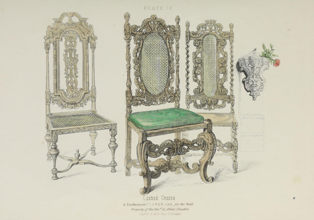 These chairs, the property of the Rev. G. Abbes, are of walnut wood, and very excellent execution. The flower-jar is Dutch, of a kind of earthenware, judging from the number of specimens remaining, much imported about a century and a half ago. A vessel for the same purpose might be now manufactured with advantage.