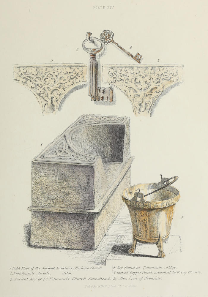 1 Frith Stool of the Ancient Sanctuary, Hexham Church. 2 Enrichments Arcade, ditto. 3 Ancient Key of Sᵗ. Edmund’s Church, Gateshead. 4 Key found at Tynemouth Abbey. 5 Ancient Copper Vessel, presented to Wreay Church, by Miss Losh of Woodside.