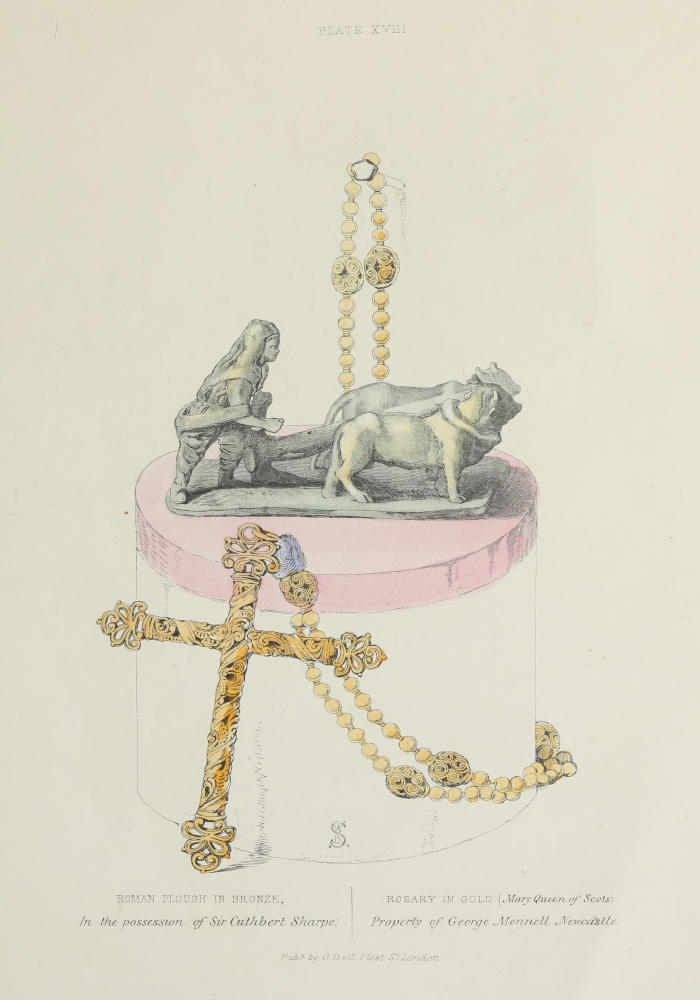 This antique is curious as showing the mode of ploughing, probably introduced into Britain by the Romans. The oxen are heavily harnessed, and there is an appearance of bands round the inner horns of each. The right hand of the figure has probably held a long goad. It was found at Piercebridge, Durham. The Rosary is gold, having 110 round beads, and 11 large of filigree work, was sold in Edinburgh[11] by a French refugee, Captain Leger, at the beginning of the century, who claimed to be a descendant from Melville, Queen Mary’s Secretary, and to have had the relic with others in his family from that time. As far as internal evidence goes it belongs to the date attributed to it. It is now in the possession of George Mennell, Esquire, Newcastle.
