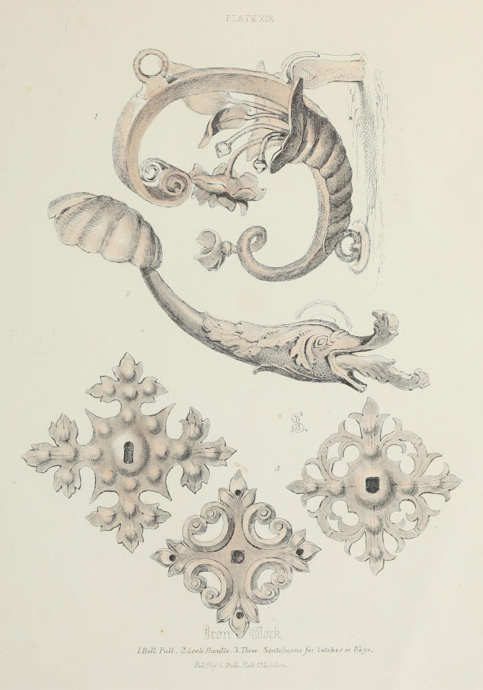 1. Bell Pull. 2. Lock Handle. 3. Three Scutcheons for Latches or Keys.