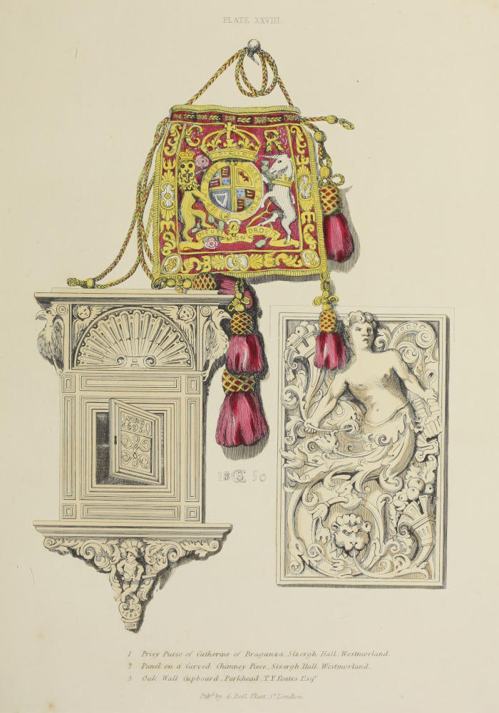 1. The Privy Purse of Catherine of Braganza, at Sizergh, the seat of the Strickland family. Sir Thomas Strickland was keeper of the privy purse to Catherine, till the operation of the Test Act compelled him and other Roman Catholics to relinquish the place. He vacated his seat in Parliament as knight of the Shire for Westmoreland at the time of the Popish plot. Miss Strickland in her life of this Queen, thus mentions the relic. The privy purse, the badge of his office is still preserved among the heir-looms of the family at Lizergh. It is of crimson velvet, the size and shape of a reticule, richly embroidered with the royal arms, and the initials C. R. in gold and silver twist and coloured silk twist.