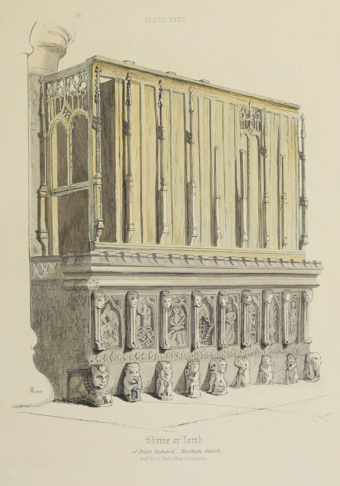 1. The Frith-Stool or Seat of Peace, of the Sanctuary of Hexham. “There were four crosses set up at a certain distance from the church, in the four ways leading thereto, within which the whole town of Hexham was included. If a malefactor flying for refuge was taken within these crosses but without the town, the arresting party forfeited 200, a sum probably represented by £10. If within the town, 600; within the walls of the church-yard, 600; within the Church, 1200; within the choir, 1800; but if the pursuer dared to take the fugitive from the Frith-Stool, or from among the holy relics behind the altar, the offence was beyond redemption.” W. Sidney Gibson.