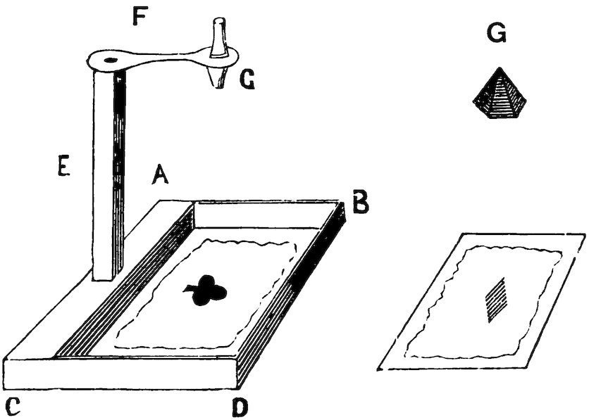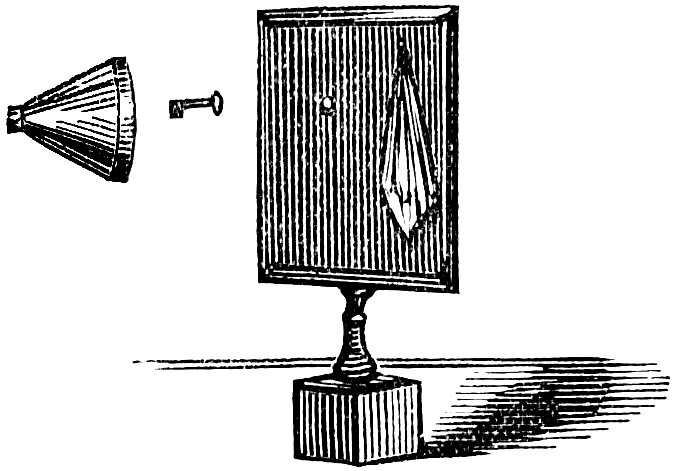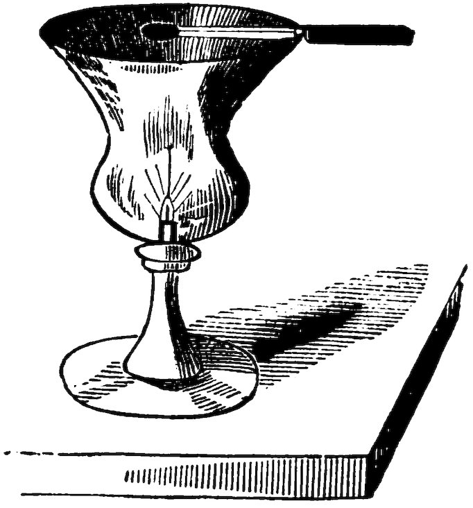 Explanation.—The bottom of the glass is of the same dimension as a half-crown. A disc of sheet-glass is cut of the same size exactly. This is substituted for the coin, and is felt within the handkerchief. When it falls, the sound is so like that of metal that all are filled with error. When the cover is removed, the water prevents the glass piece being seen at the bottom even by the operator himself.