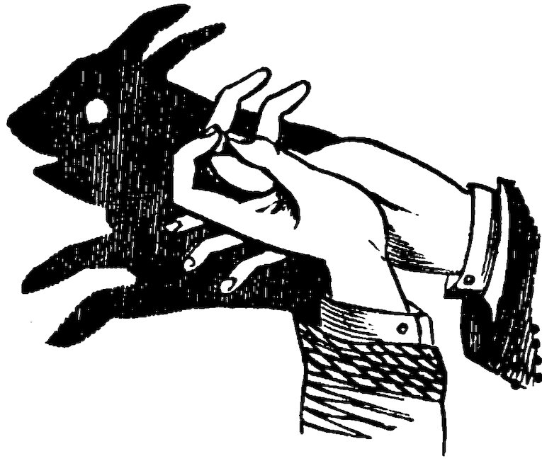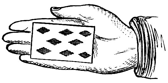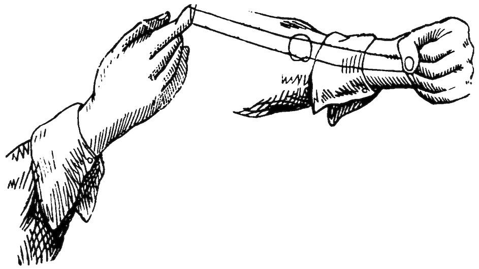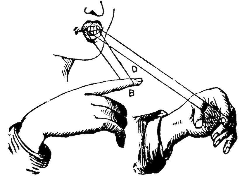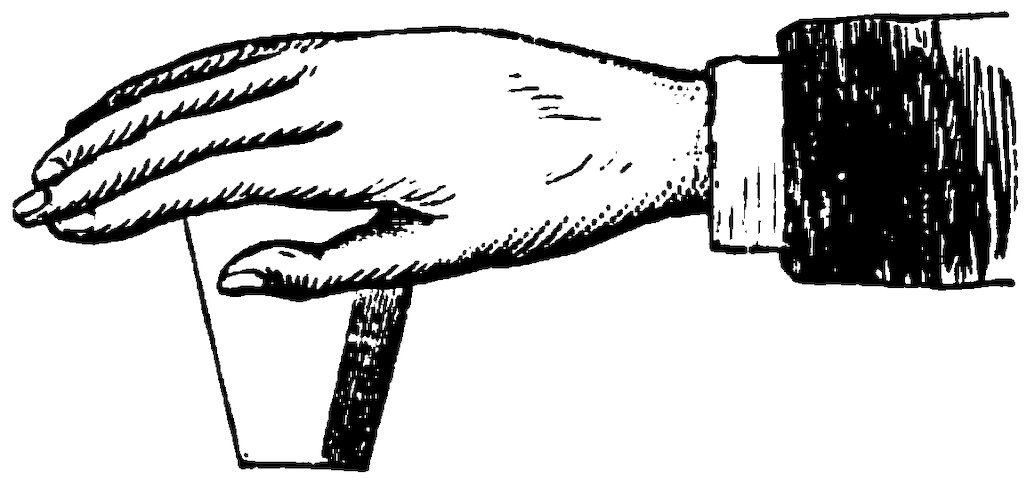 Take two pieces of white paper, about the size of a sixpence, and moisten them well on both sides. Put one on the first joint of each forefinger, just at the root of the nail, and place these fingers on the edge of the table, straight out, while the rest are closed up under the hands.