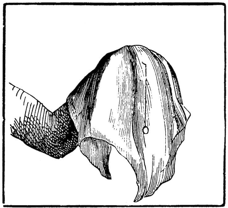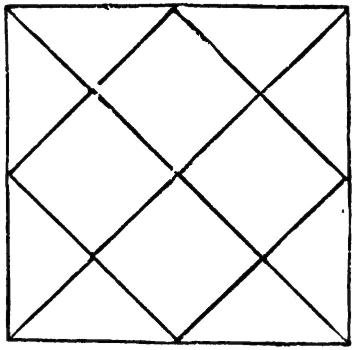 Take two pieces of fancy paper with one side in colours, patterns, or marbling, about seven inches square, put the coloured sides together, and cut them at the same time in the shape of Fig. 7.