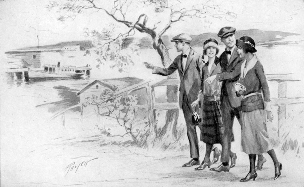 Polly was aroused from her concern over the recent customer by the abrupt realization that[10] he had forgotten to pay for his entertainment. She sighed. Kewpie already owed more than the school rules allowed. Just then the door opened to admit a slim, round-faced boy of about Polly’s age. He had red-brown hair under his blue school cap, an impertinent nose, and very blue eyes. He wore a suit of gray, with a dark-blue sweater beneath the coat. He wore, also, a cheerful and contagious smile.