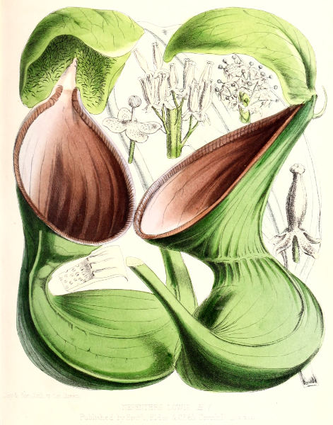 I must likewise draw attention to the exquisite manner in which the plates of the Nepenthes are coloured, and to the beauty of the engravings in general. They are admirably illustrative of the country, and do very great credit to the lithographers, Messrs. Day and Son, and to their excellent draughtsmen. I ought also to mention that the Nepenthes are drawn less than half the natural size, as it was found impracticable to introduce the full size without many folds, which would have speedily destroyed the beauty of the plates.
