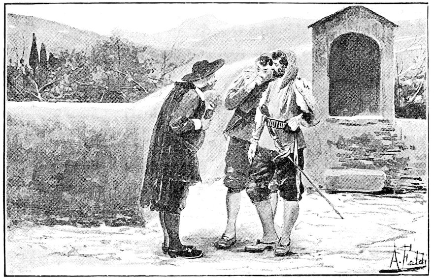Most plays of this description partook rather of the character of farce than of legitimate comedy. The principal personages—Harlequin, Columbine, Pantaloon, Coviello, Scaramouch, etc.—who make their appearance in every one, had certain fixed traditional costumes and masks, which were never departed from. The familiar figure of Punch, which has been so completely naturalised as to appear one of the most English of all English institutions, was handed down through many generations of Italian players before he reached our shores. As “Pulcinella” or “Polecenella” he is a typically Neapolitan figure; while Stenterello, another favourite mask, is as typically Tuscan. The name is supposed to be derived from “Stentare” (to be in great want)—the Tuscans, and more especially the Florentines, being famous throughout the Peninsula for economy—not to say meanness—which is a prominent feature in Stenterello’s character.
