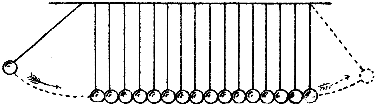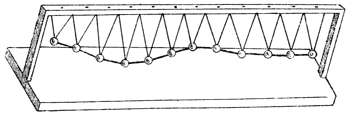 Again, another form of wave-motion may be illustrated by the model shown in Fig. 4. In this case a number of golf-balls are hung up by strings, and spiral brass springs are interposed between each ball. On giving a slight tap to the end ball, we notice that its to-and-fro motion is handed on from ball to ball, and we have a wave-motion[7] in which the individual movement of the balls is in the direction of the wave-movement, and not across it.