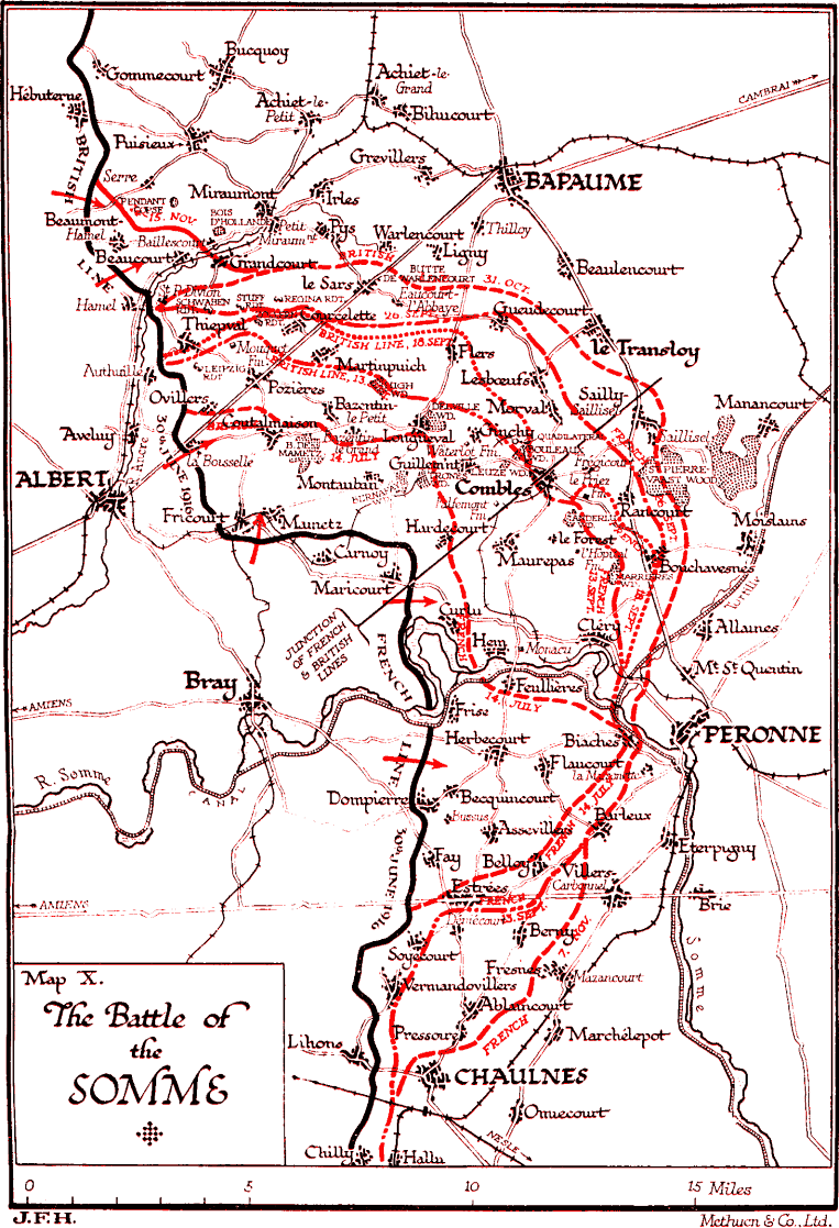 The Germans made comparatively little headway on the 22nd against the Third Army; but Gough's last reserves were thrown in without stopping the German advance on our right, and the meagre French division which Fayolle was able to send across the Oise could not dam the torrent. At night the enemy had penetrated our third defensive position, and Gough ordered a retreat to the unfinished bridgehead on the Somme. Byng's right had to conform to this movement, which did not stop east of the Somme; for on the 23rd the Germans had crossed the river south-east of Ham, more than a dozen miles from their starting-point, and the Pronne bridgehead had to be abandoned. Even on the west bank Gough's right was thus endangered, and his left was threatened by a German attempt to break a gap north of Pronne between his army and Byng's Third. This effort on the Somme, where it runs due west from Pronne to Amiens, now became the chief and most promising objective of the German strategy. The link between our two armies was extremely fragile, and misunderstandings arose between the two staffs. Fortunately the worst disaster was averted by Byng's timely withdrawal from Monchy, which disconcerted and postponed the German attack on Arras.