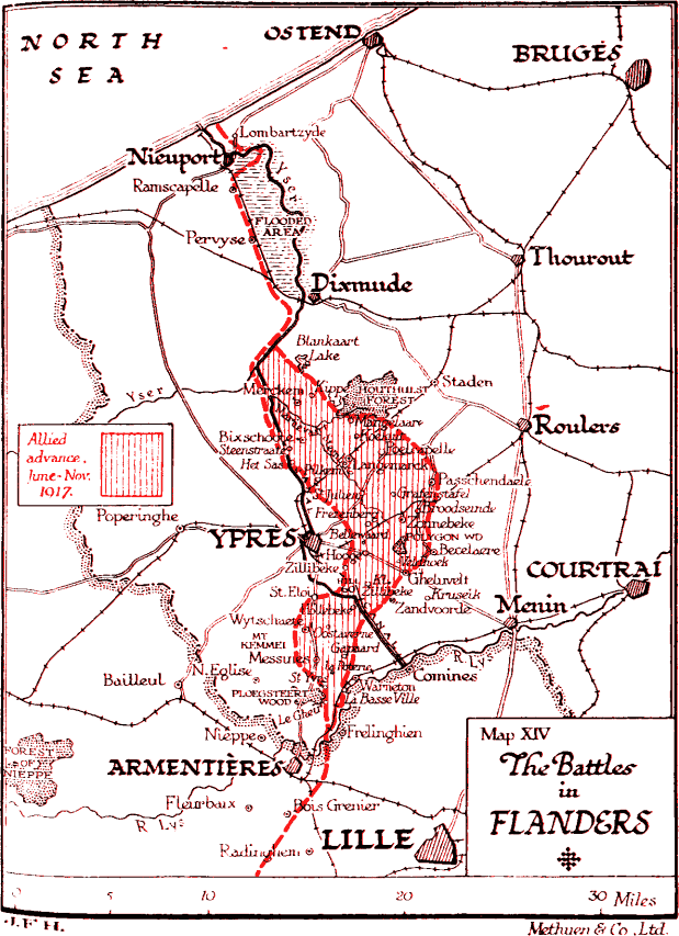 A great wedge had thus been thrust into the German line, leaving pronounced salients to the north of it round Lille and Douai, and to the south-east of it between the Oise and the Aisne. It was the policy of the Entente to eschew the destruction which fighting in cities involved, and it was particularly desirable to compel the Germans to retreat from Lille and its industrial neighbourhood by threats of encirclement rather than by frontal attack. To complete the process begun on the south, the advance in the north was now resumed; and on 14 October Belgian forces with a French army under Dgoutte and the British Second Army under Plumer attacked the whole front in Flanders between Dixmude and the Lys at Comines. Their success was even more striking than it had been on 28 September; the Belgians and French carried Courtemarck, Roulers, and Iseghem, while the British pushed along the north bank of the Lys until on the 16th they held it as far as Harlebeke, farther east than Ostend and even than Bruges. On the 15th the Belgians captured Thourout and the British Menin, crossing the Lys at various points and taking Comines on the 16th. The effect of this advance was to precipitate a comprehensive German retreat both north and south. The coveted Belgian coast had at last to be abandoned: Ostend fell on the 17th, Zeebrugge and Bruges on the 19th, and by the 21st the Germans were twenty miles from the sea, striving to stand on the Lys canal in front of Ghent. To the south the withdrawal was no less complete: both Lille and Douai were entered on the 17th; Tourcoing and Roubaix soon followed; and by the 21st our Second and Fifth armies had advanced to the Scheldt on a front of twenty miles, forming nearly a straight line with the First, Third, and Fourth on the Selle.
