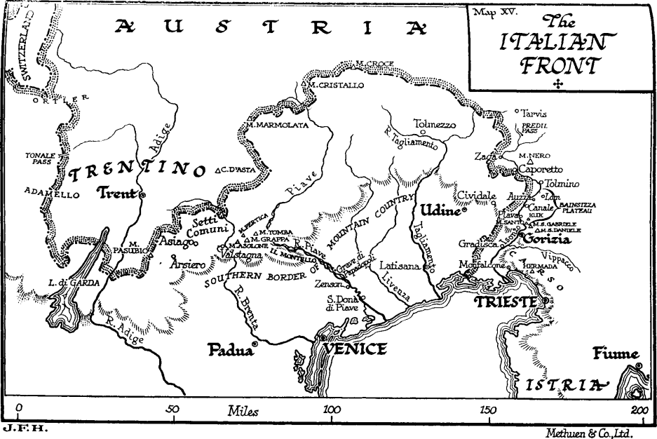The German attack began on 24 October amid rain and snow, which never deterred the Germans, and on this occasion even assisted them by increasing the element of surprise. The infected front of the Second Army between Zaga and Auzza broke with such celerity that by dawn of the 25th Von Buelow's men had crossed the Isonzo, scaled Mount Matajur, 5000 feet high, and were pouring across the Italian frontier; and the gains of twenty-nine months were lost in as many hours. Elsewhere Italian troops fought with splendid determination, and the garrison of M. Nero held out for days and died to a man, while their comrades at Caporetto greeted the enemy with white flags, and reserves withheld their assistance. Gallantry to the left and right availed nothing against poltroonery in the centre: the Bainsizza plateau was lost, and the Third Army on the Carso was in dire peril of being cut off from its retreat. Nothing but retreat, and perhaps not even that, was open to the other armies, with the Second in the centre fleeing like a rabble and Von Buelow threatening the left and right in the rear. On the 27th Cividale, on the 28th Gorizia, and on the 29th Udine, twelve miles within the Italian frontier, fell, and Von Buelow had taken 100,000 prisoners and 700 guns. The Third Army escaped by the skin of its teeth, the excellence of its discipline, and the sacrifice of its rearguards and 500 guns at the crossing of the Tagliamento at Latisana on 1 November. Then the rain came down, and no believer in Jupiter Pluvius as a German god could maintain that that river had been turned into a roaring torrent in the interests of the German pursuit.