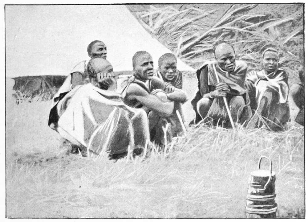 In the afternoon about seventy Wakamba, driven northwards by famine, came to the opposite bank of the river and attempted to cross over to Maranga by means of our rope. They were extremely emaciated, and so weak that three or four of the first dozen were washed away from the rope and drowned. Suddenly the Maranga who were watching them raised a shrill cry of “Ndui! Ndui!” (small-pox), and rushing at those of the Wakamba who had already landed, they drove them into the water and across the river again. It seemed hard to repulse the poor starving wretches, but the Maranga have already suffered so heavily from the small-pox that they had no wish to repeat the experience. There were quite a dozen of the Wakamba in an advanced stage of confluent small-pox. From our camp we could hear them moaning and wailing all night, for several nights. In the daytime they used to come down to the only place at which they could reach the water, a large flat rock a little[Pg 355] way up stream, which was just awash, where they would sit for hours laving themselves with the cool water.