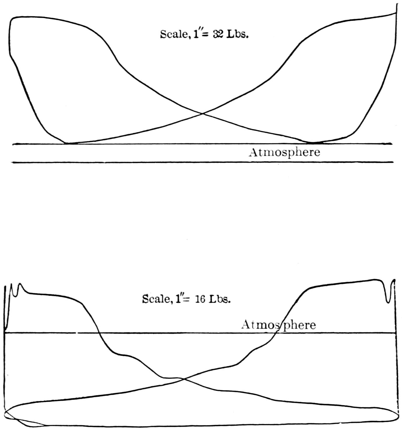 When the first pair of Willimantic engines was started I was disappointed in their economy, and made up my mind that the excessive waste room was accountable for it. The proportion of cross-section area to the stroke being fifty per cent. greater than in my table of sizes increased in the same degree the proportion of waste room to the piston displacement. I felt that there was need here for improvement. By far the greatest amount of waste room was in the exhaust ports. I accepted a modification of the exhaust valves by which this item of the waste room was reduced fully one half and made a new pair of cylinders for this engine. The improvement in the economy was so marked that I determined to change the exhaust valves of all the engines. Only the exhaust valves and ports needed to be changed. These were drawn anew in pencil and carefully studied and approved of by me. It was necessary that the entire combined cylinder drawing should be retraced, but this, except only the exhaust ports and valves, was to be copied over the existing tracings. This did not require my attention, and I gave no thought to it. Here was the superintendent’s opportunity. In copying these tracings he had only to move the straight line representing each face of the piston on the longitudinal section of the cylinder seven eighths of an inch, thus adding this amount to the piston at each end, and shorten the cylinder heads to correspond, and the job was done; and there did not exist among the large number of persons in the drawing-office and shop who[323] must have been aware of this change, loyalty enough to let me know anything about it.