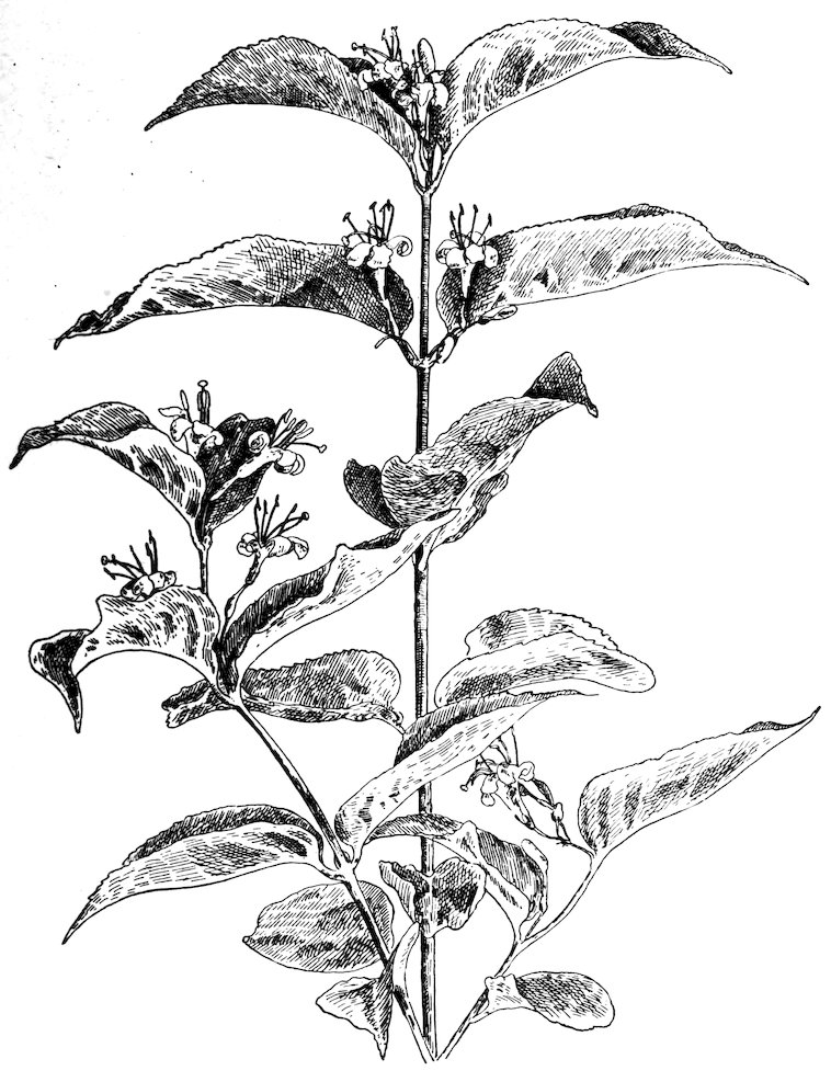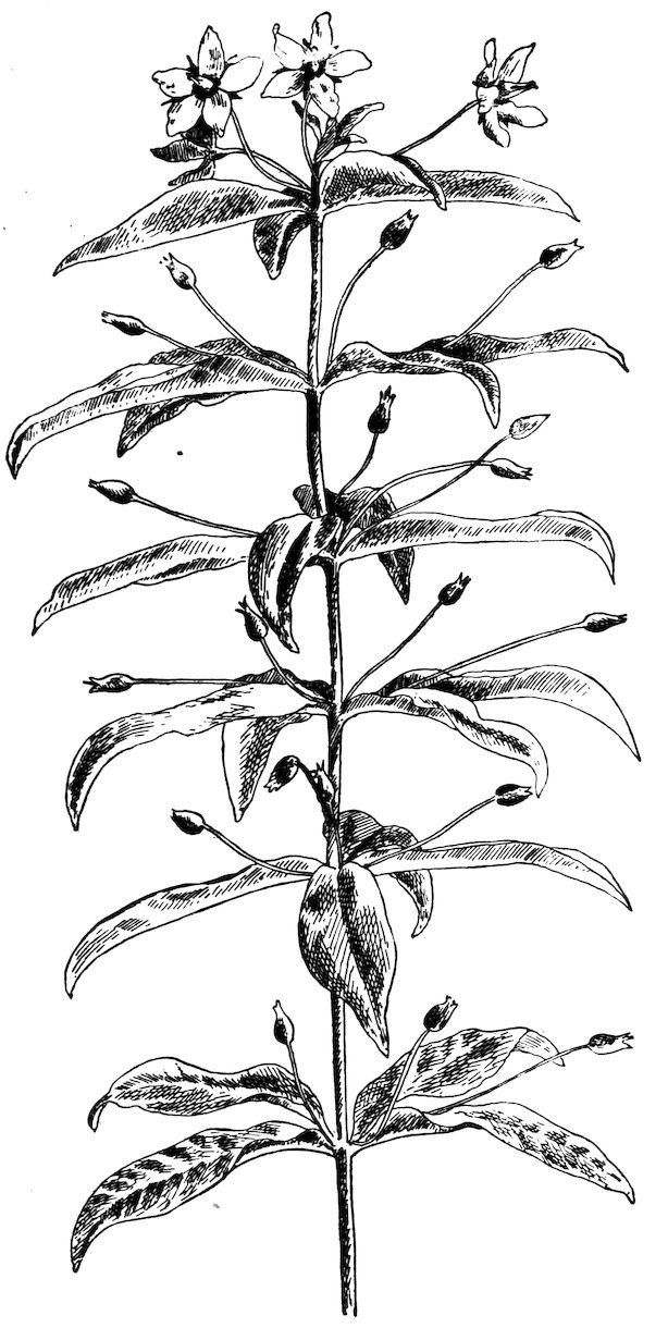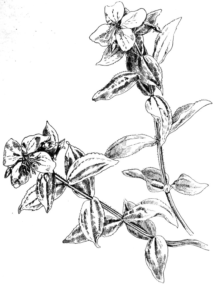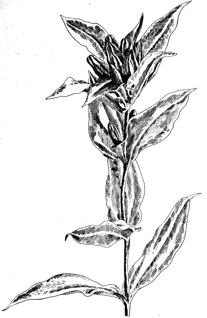 Stem.—Slender, branching, one or two feet high. Leaves.—Opposite, ovate, lance-shaped, partly clasping. Flowers.—Pale blue, smaller than those of the closed gentian, in clusters of about five at the summit of stems and branches. Calyx.—Four or five-cleft, small. Corolla.—Funnel-form, four or five-lobed, its lobes bristle-pointed. Stamens.—Four or five. Pistil.—One, with two stigmas.