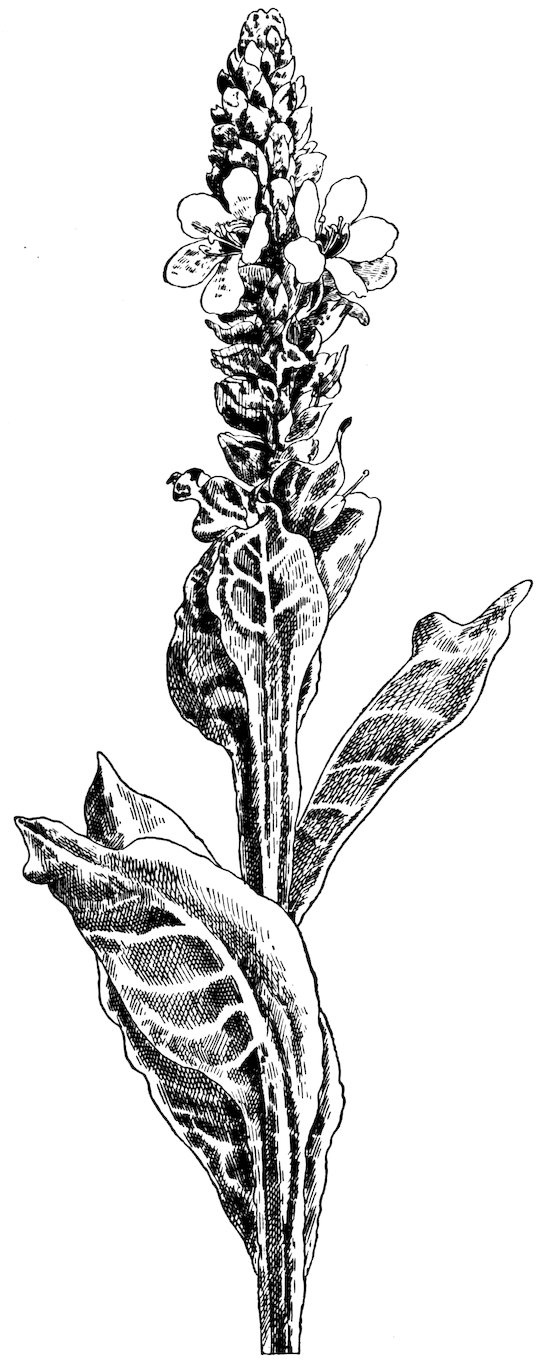 278The purplish shell-like leaf, which curls about the tiny flowers which are thus hidden from view, is a rather grewsome-looking object, suggestive of a great snail when it lifts itself fairly above its muddy bed. When one sees it grouped with brother-cabbages it is easy to understand why a nearly allied species, which abounds along the Italian Riviera, should be entitled “Cappucini” by the neighboring peasants, for the bowed, hooded appearance of these plants might easily suggest the cowled Capuchins.