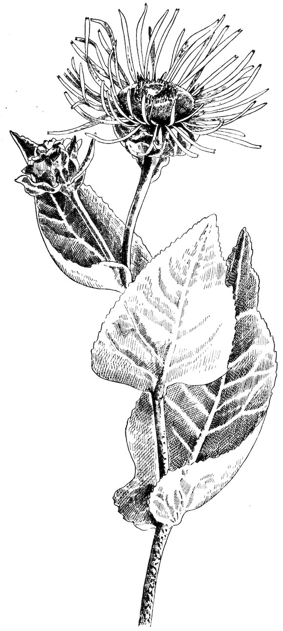 Height.—Two to four feet. Leaves.—The lower cleft or toothed, the uppermost oblong and undivided. Flower-heads.—Nodding, composed of white or greenish strap-shaped flowers surrounded by a purplish involucre.
