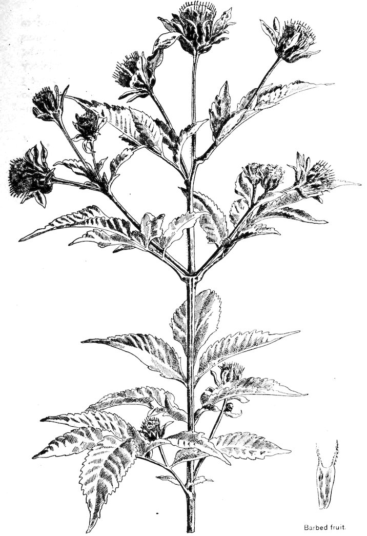 Height.—About two feet. Leaves.—Roughish, the lower lobed, the upper oblong lance-shaped. Flower-heads.—Nodding, composed of greenish or cream-colored strap-shaped flowers surrounded by a greenish or purple involucre.