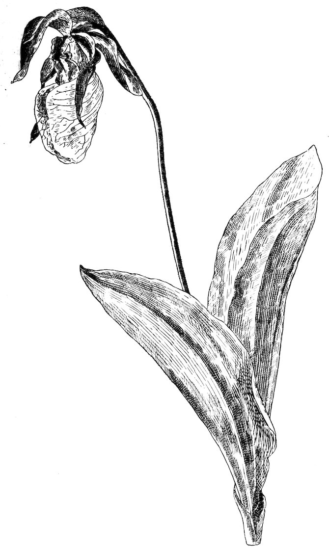 These quaint little preachers, ensconced in their delicate pulpits, are well known to all who love the woods in early spring. Sometimes these “pulpits” are of a light green veined with a deeper tint; again they are stained with purple. This difference in color has been thought to indicate the sex of the flowers within—the males are said to be shielded by the green, the females by the purple, hoods. In the nearly allied cuckoo-pints of England, matters appear to be reversed: these plants are called “Lords and Ladies” by the children, the purple-tinged ones being the “Lords,” the light green ones the “Ladies.” The generic name, Arisæma, signifies bloody arum, and refers to the dark purple stains of the spathe. An old legend claims that these were received at the Crucifixion: