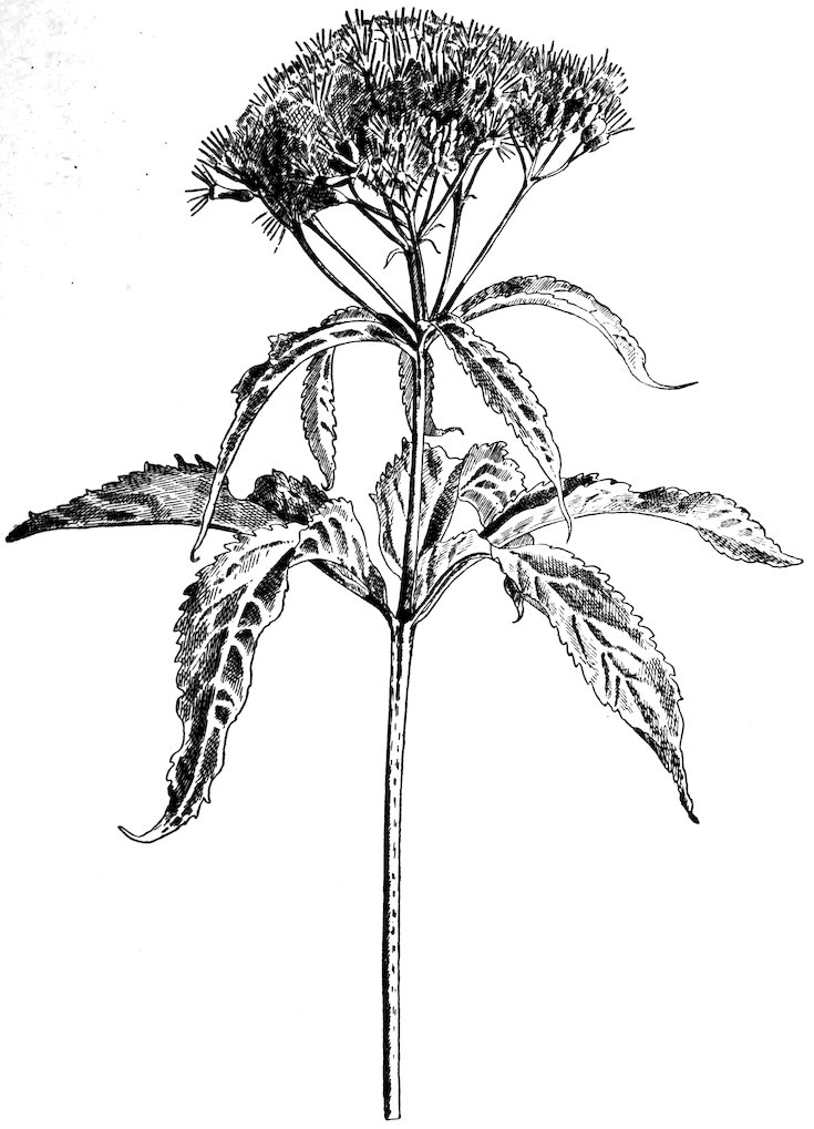 Stem.—Leafy, usually tall. Leaves.—Alternate, somewhat lance-oblong. Flower-heads.—An intense red-purple, loosely clustered, composed entirely of tubular flowers.