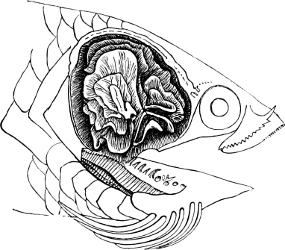 [39] For other illustrations see p. 73, Fig. 35 (palatal view of head); p. 74, Fig. 36 (pectoral skeleton); p. 141, Fig. 60 (gills); p. 148, Fig. 65 (lung); p. 151, Fig. 67 (heart); p. 134, Fig. 57 (intestine); p. 165, Fig. 77 (ovary).