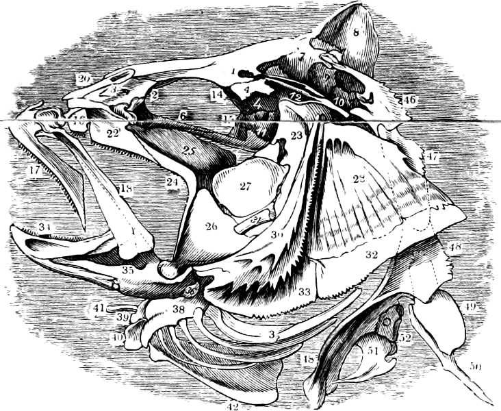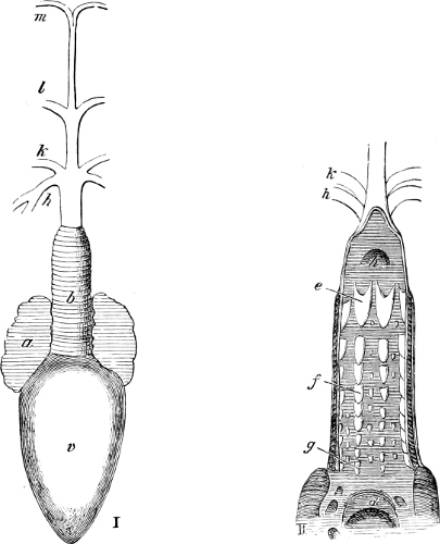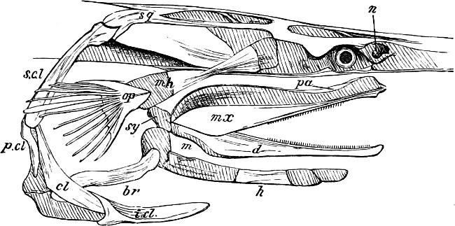 This sub-class is represented by a single family (Cirrostomi) and by a single genus (Branchiostoma);[48] it is the lowest in the scale of fishes, and lacks so many characteristics, not only of this class, but of the vertebrata generally, that Hæckel, with good reason, separates it into a separate class, that of Acrania. The various parts of its organisation have been duly noticed in the first part of this work.