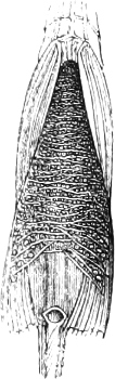 Scaly fishes are skinned thus: with a strong pair of scissors an incision is made along the median line of the abdomen from the foremost part of the throat, passing on one side of the base of the ventral and anal fins, to the root of the caudal fin, the cut being continued upwards to the back of the tail close to the base of the caudal. The skin of one side of the fish is then severed with the scalpel from the underlying muscles to the median line of the back; the bones which support the dorsal and caudal are cut through, so that these fins remain attached to the skin. The removal of the skin of the opposite side is easy. More difficult is the preparation of the head and scapulary region; the two halves of the scapular arch which have been severed from each other by the first incision are pressed towards the right and left, and the spine is severed behind the head, so that now only the head and shoulder bones remain attached to the skin. These parts have to be cleaned from the inside, all soft parts, the branchial and hyoid apparatus, and all smaller bones, being cut away with the scissors or scraped off with the scalpel. In many fishes, which are provided with a characteristic dental apparatus in the pharynx (Labroids, Cyprinoids), the pharyngeal bones ought to be preserved, and tied with a thread to the specimen. The skin being now prepared so far, its entire inner surface as well as the inner side of the head are rubbed with arsenical soap; cotton-wool, or some other soft material is inserted into any cavities or hollows, and finally a thin layer of the same material is placed between the two flaps of the skin. The specimen is then dried under a slight weight to keep it from shrinking.