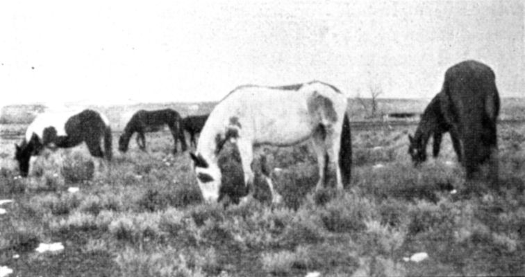 Pinto (pĭn′tō). Painted, mottled, or vari-colored. Many of the Indian ponies were pinto ponies. (See pictures on pages 11 and 54.)