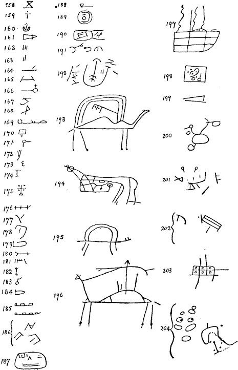 Some of the more complicated signs may only be idle scratchings;[335] drawings, for instance, such as No. 34 are often to be seen upon blotting pads, being made by some writer during the intervals of his composition. But such signs as Nos. 16, 142, 148, 149 and 153 recall the curious ligatured monograms sometimes used by the modern Tawarek in their writings, or the cryptograms, mentioned by Duveyrier and H. Barth, that the Tawarek women sometimes amuse themselves by inventing, that can only be deciphered by those to whom they have imparted the key.[29]