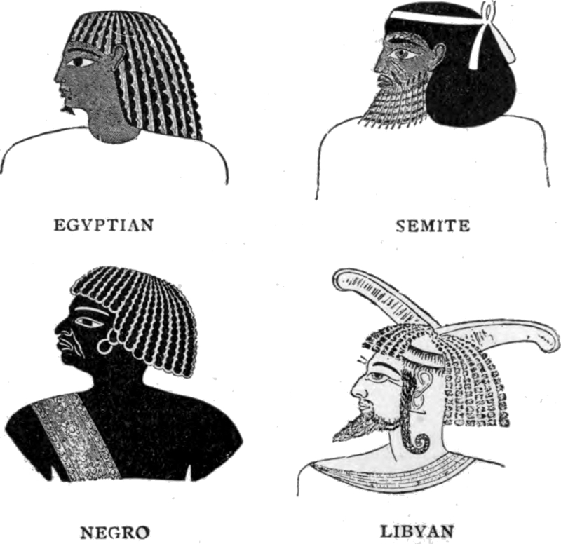 In Egypt there is an immense amount of pictorial and sculptured material for ethnological study, covering a range of many centuries. Over three thousand years ago the artists—“untrained but not unobservant ethnologists”[3]—decorated the walls of royal tombs with representations of the four races of mankind, among whom the Egyptians of the nineteenth dynasty supposed the world to be partitioned—(1) The Egyptians, whom they painted red; (2) the Asiatics or Semites, yellow; (3) the Southerns or Negroes, black; and (4) the Westerns or Northerners, white, with blue eyes and fair beards. Each type is clearly differentiated by peculiar dress and characteristic features. In addition to these four types, other human varieties were delineated by the Ancient Egyptians, most of which can be identified. “On the 11Egyptian monuments we not only find very typical portraits, but also an attempt at classification; for the Egyptians were a scientific people, with a knowledge of medicine, and also skilled mathematicians; therefore their primitive anthropology is not unexpected.”[4] This facility for race discrimination was still earlier exhibited in the prehistoric or early historic slate palettes of Egypt.