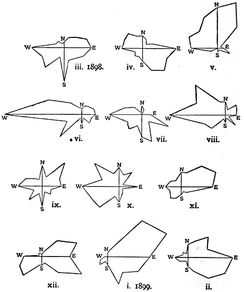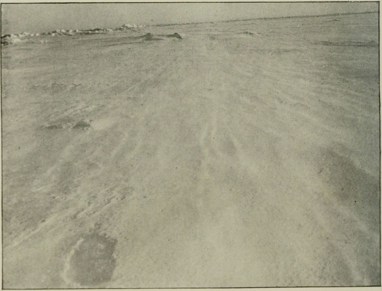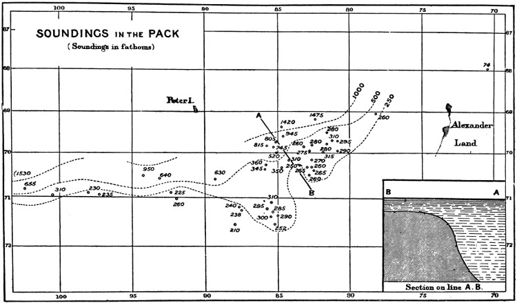 From the month of December, 1898, up to March, 1899, easterly winds were predominating, and these caused a very considerable drifting of the ice. In the course of these three months we drifted in this way from about 87° longitude west of Greenwich as far as to 103°, or a distance of about 950 kilometres (this distance is calculated in a straight line on the seventy-first parallel circle). That this easterly wind, which prevailed for such a length of time and mostly with great violence, was no local wind, we can safely assume. Its place of origin was no doubt the regions around Grahamland and Alexander Islands. This gives me further cause to believe that the sea along the western coast of these countries was perfectly navigable during the months of February and March, 1899. But there is no reason whatever to suppose that this is the case every year. On the contrary, previous expeditions have always found this part of the antarctic drift-ice completely closed. We, on board of the Belgica in February, 1898, also found within the drift-ice along these countries absolutely no navigable water. If a future expedition were to choose the same region where the Belgica did its work for a field of investigation, my unqualified advice to it would be to linger for some time near the coast of these countries, awaiting a separation of the ice from the land. What a great advantage there would be in navigating alongshore! Possibly harbours might be discovered, stations built, and depots established, and one would then always have something to depend on. During our drift in the ice we never dared venture on foot so far out as to lose sight of our ship. It would be wholly different if there were regular stations from which to start the work. We could[452] then safely proceed southward with a sleigh-boat and possibly accomplish fine results, for the antarctic ice, compared to the arctic ice which I have had a chance to observe, is much more level and even, and consequently easier to traverse.