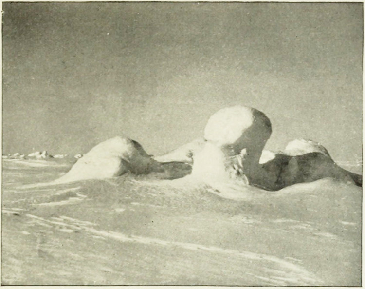 Are there not people or unknown animals in the regions around the south pole? Novelists have pictured this mysterious region since the time of Dalrymple, in 1760, with curious races of people and strange forms of animal life. It is the last unexplored expanse on the globe of sufficient area to offer room for fictitious creations of new worlds, and it will continue to be a special domain for imaginative writers for many years. From the explorations thus far, we have no reason to hope for any startling discoveries of human or other animal life. Borchgrevink, owing to his inexperience and hasty conclusions, mistook ordinary penguin tracks for the footprints of some large and unknown animal. No reliable traces of either large new animals or human beings have been found. The regions are, as homes for adapted people, far superior to the arctic lands, where the Eskimos periodically starve or live in blubbery abundance. If sailors or wild people were cast[462] adrift on the antarctic shores they would not necessarily starve. There is food and fuel, and even clothing, to be had from the seals and penguins everywhere. The life would not be full of comforts, if measured by our standards, but compared to Eskimo existence there is a decided advantage in life-sustaining prospects of the southern pole—not in climate or in the degrees of cold, but in the certainty of food. People then, if they once find a foothold, might easily thrive, but to the present we have found but one doubtful sign. This was reported by Captain Larsen, the Norwegian sealer, in 1893. Larsen found about fifty clay balls, perched on pillars of the same material, on Seymour Island, off the eastern coast of Grahamland. “These,” said Larsen, “had the appearance of having been made by human hand.”