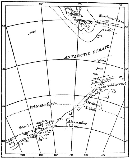 The possibilities of exploration in the far south are many, and properly to understand them we must first review the regions actually known. Perhaps it is not correct to say that anything antarctic is actually known. Almost the entire space beyond the polar circle, with the exception of a few dotted lines, is a blank upon our charts. Even the sub-antarctic lands, like Tierra del Fuego, Kerguelen, and the Auckland Islands, are for scientific purposes unknown. Of the truly antarctic lands the first in time of discovery and in value is the always accessible land-mass south of the South Shetland Islands, which is erroneously charted Grahamland.