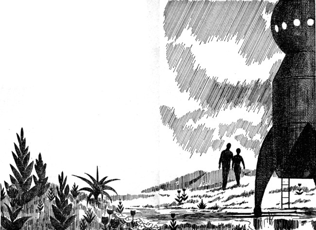 He sat disconsolately down on the ground several feet from one of the landing jacks. Sonya sat down beside him. "We won't be able to go back at all now," she said. "Neither your ship nor mine can carry us both, and there's no way we can occupy more than one of them at a time."