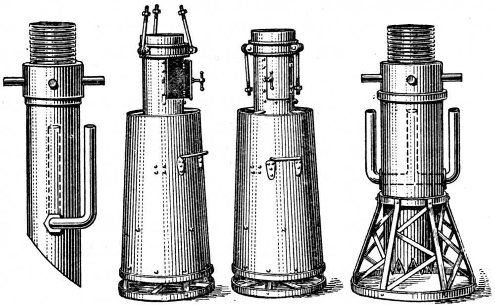 The simplest form of compressed air pump consists of a closed chamber or tank immersed in the water, to be raised or fixed at such a level[Pg 95] that the water will flow into the tank. An air pipe is connected to the top of the chamber, and the rising main is carried inside the tank to the bottom. On opening the air valve, pressure is exerted on the surface of the water in the tank, and the water is expelled through the lift pipe or rising main. On closing the air valve, water again fills up the tank, and the process is repeated.
