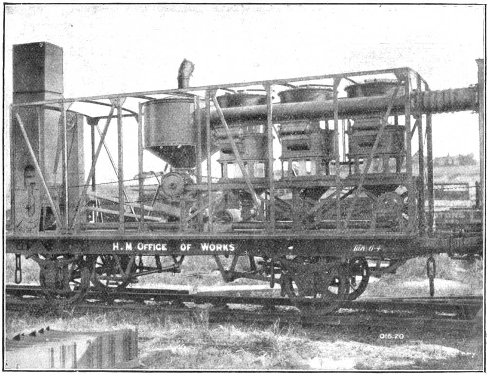 The housing problem has developed the pneumatic handling of cement in a liquid form, and houses are now being built of reinforced cement in the following manner. An expanded steel frame is supported between concrete or brick piers, and on wood sheeting where necessary, and liquid cement is blown on to the metal in the form of a liquid spray: the first coat dries quickly and leaves a certain amount of cement covering the framework. Then follows another coat, and again another and so on, until the whole of the framework has been covered to an appreciable thickness. The result is a thin wall or slab of cement reinforced with the steel and of great combined strength. Slightly domed roofs constructed in this manner have proved very strong and durable.