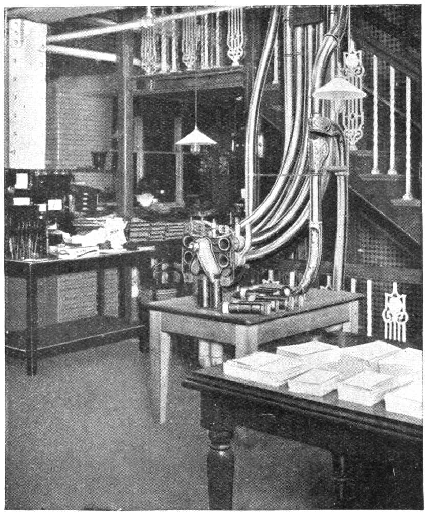 In addition to the conveyance of messages and papers, they are frequently installed to convey money and bills from the numerous departments of a large store to the cashiers, thus saving time and effecting economy in labour and floor space. One cashier can attend to from 10 to 15 stations, or in small establishments all the stations can be centralized around the book-keeper.