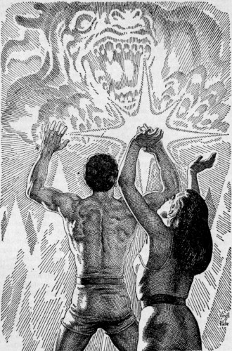 Harvey jerked back, shuddered to fight back a yell, and ran madly down the hill toward Dana, but she was no longer in sight. For one wild second Harvey thought she had disappeared over the Edge. A look confirmed the fallacy of the notion. But behind him, the three floating red eyes stared impassively. Angrily, he wrenched them from the air and flung the glowing coals out into Infinity, and had the satisfaction of watching them dwindle into nothing. He had no idea what they were; all he knew was he hadn't liked them.