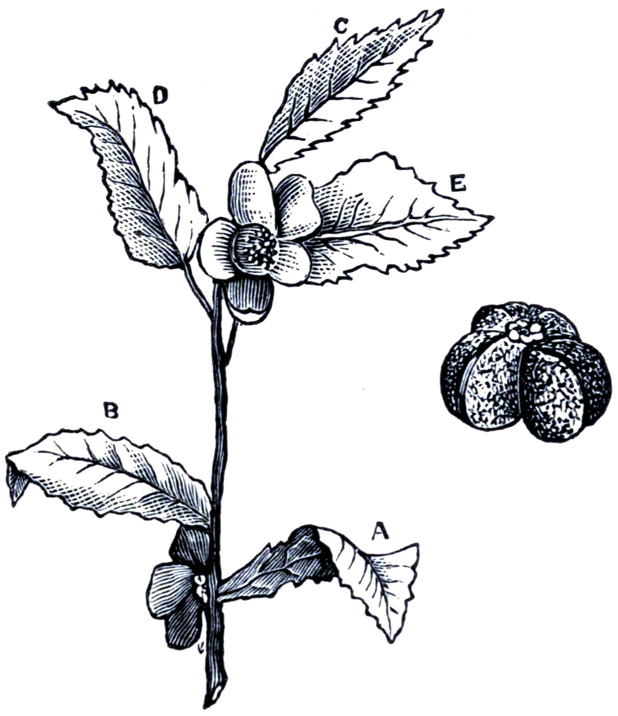 Two other species described by Loureiro, but unknown to commerce, are classed as Thea Cochinchinensis, found in a wild state in the north of Cochin-China, where it is also extensively cultivated, but used medicinally by the natives as a diaphoretic. And Thea Oleosa (oil tea), grown in the vicinity of Canton, the seeds of which yield an oil used for illuminating purposes as well as an article of diet by the inhabitants. In addition to these there 46are also two doubtful species, known as Cankrosa and Candata, referred to by Wallach, as growing in Silhet and Nepaul.