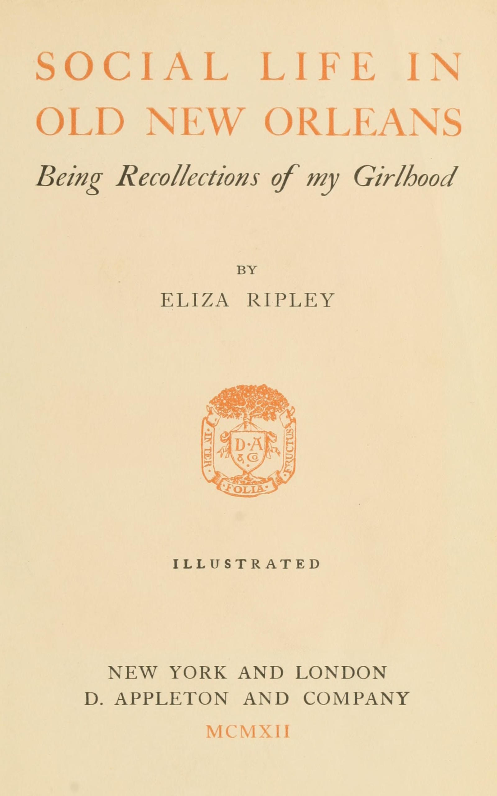 “Children should be seen and not heard.” Children were neither seen nor heard in the days of which I write, the days of 1840. They led the simple life, going and coming in their own unobtrusive way, making no stir in fashionable circles, with laces and flounces and feathered hats. There were no ready-made garments then for grown-ups, much less for children. It was before California gold mines, before the Mexican war, before money was so abundant that we children could turn up our little noses at a picayune. I recall the time when Alfred Munroe descended from Boston upon the mercantile world of New Orleans, and opened on Camp Street a “one price” clothing store for men. Nobody had ever heard of one price, and no deviation, for anything, from a chicken to a plantation. The fun[2] of hectoring over price, and feeling, no matter how the trade ended, you had a bargain after all, was denied the customers of Mr. Alfred Munroe. The innovation was startling, but Munroe retired with a fortune in course of time.