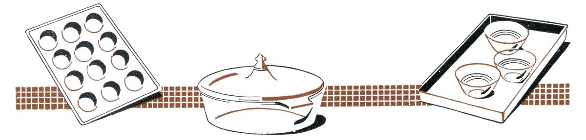 | Muffin Pan ... deep or shallow cups. | Casserole or Baking Dish ... with cover. | Individual Custard Cups ... set in shallow pan to bake. |