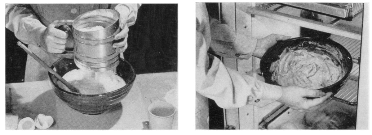 | 1 Sift flour through large open sifter (to aerate it) onto square of paper before measuring. | 2 Then spoon sifted flour lightly into a “dry” measuring cup ... heaping it up. | 3 Level off cup with straight-edged knife. Don’t shake cup. This is important! |