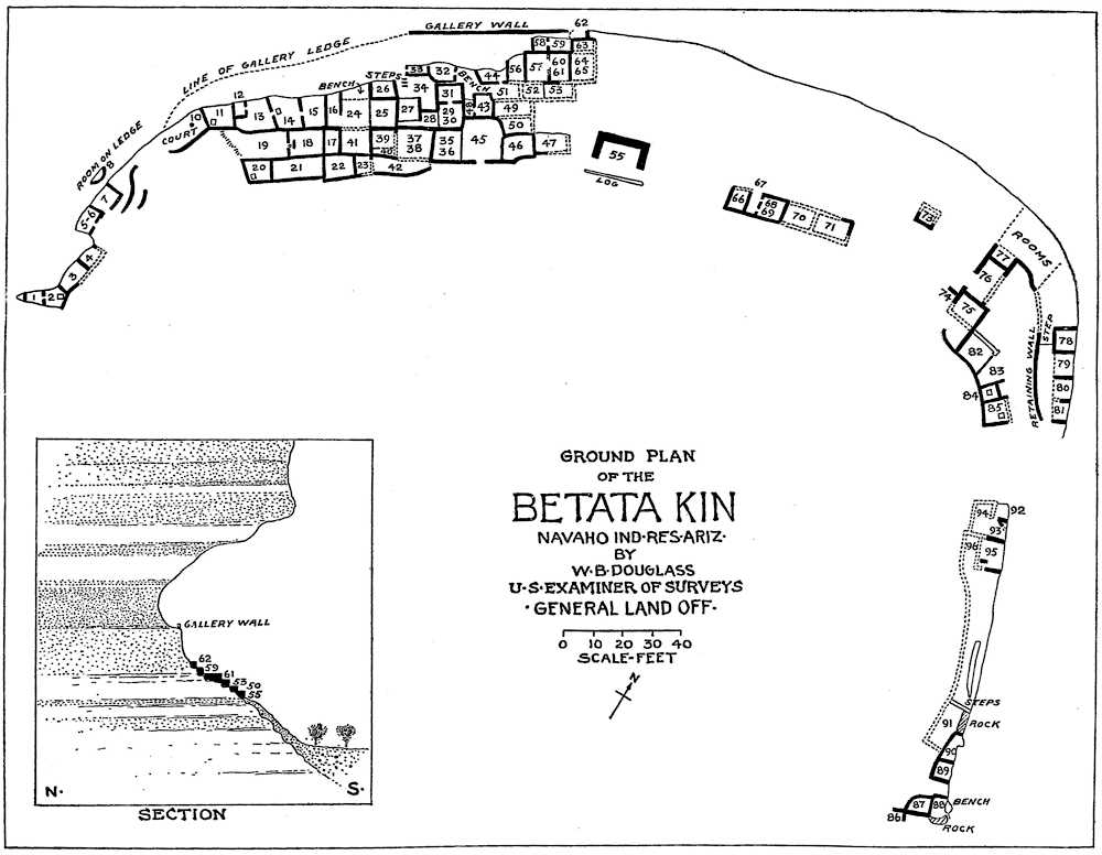 The Navaho National Monument (see sketch map, pl. 22) contains two kinds of ruins,[52] cliff-dwellings and pueblos. Most of the latter are situated on promontories or on low hills. The structural features of the cliff-dwellings are characteristic, their walls being constructed of stone or adobe built against, rarely free from, vertical faces of the cliff.