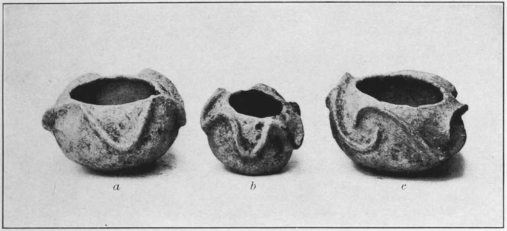 Three small bowls of crude ware are fluted on the outside, the ridge, or fluting, being raised somewhat above the surface of the bowl and having a zigzag course. One of the best of these unique ceramic forms has this fluting broken into S-shaped figures, as shown in the accompanying illustration (pl. 17, a).