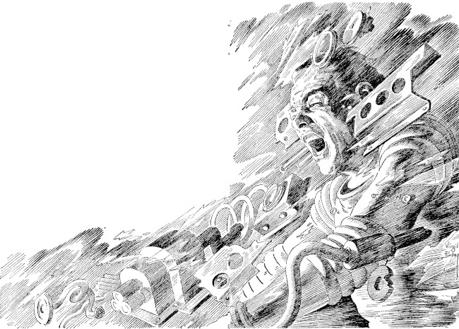 "It was just before the time periods separated and the creature that was approaching Miss Trelawney and myself seemed to drop through the top of the mesa—I suppose it fell back into the other period. I've described it. It was like a fifty-foot gray slug moving along on its tail ... and there were those two rows of something like short arms. It wasn't at all an attractive creature. I was frightened to death. But I was holding a gun—the same gun with which I had stopped another of those things when it chased me during the night. And the trouble was that this time I wasn't going to shoot."