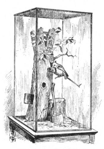 In the same hall, in cases that stand along the center of the room and in the window alcoves, are some bird groups that receive a plentiful share of admiration. They deserve it, for as specimens of accurate and artistic taxidermy they have rarely been equaled and never excelled. They reproduce feathered life and its surroundings with a fidelity that bespeaks thorough knowledge, remarkable skill, and almost infinite patience. There are birds in every attitude—perching, swimming, walking, and even flying—each in a setting that very picturesquely shows its habitation and habits. The uninitiated visitor can hardly persuade himself that the foliage, the herbage, and the flowers that he sees through the glass can be the imperishable product of an artificer’s ingenuity, and not the work of nature herself. Some of the best of the groups are the robins, with their nest among the pink blossomed apple boughs; the grebes, swimming in a happy family upon a glassy imitation of water; the laughing gulls[23] with their nest in the bent grass; the Louisiana water thrush, domiciled under an overhanging bank; the cat birds, the clapper rails, and the ruffed grouse, these last so life-like that the visitor can almost fancy he hears the brown leaves rustle beneath the feet of the chickens. Great credit is due to Jenness Richardson, the museum’s chief taxidermist, and Mrs. E. S. Mogridge, who jointly prepared this beautiful series of exhibits.