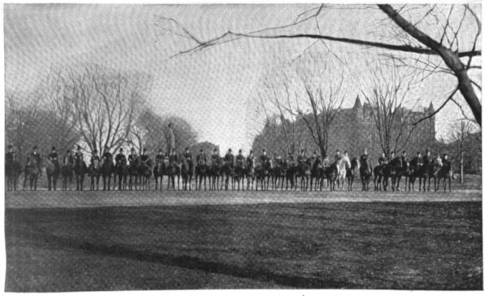 The bridle path, too, on a sunny afternoon in May, is a spectacle to be remembered. Its pictures come and pass more swiftly than those of the drive, where moderation of speed is a necessity, and is promptly enforced, in the rare cases of its infraction, by the mounted policemen. And, by the way, these sublimated graycoats are themselves worthy of a second glance. Their animals are a really beautiful and well groomed set—most of them bays—and the riders’ horsemanship is of such uniform excellence that a stranger in the park can hardly distinguish one member of the mounted force from another. And in their patrol over fourteen miles of driveway and bridle path their duty is by no means a sinecure. Their courage and promptitude have often been tried by the accidents caused from time to time by untrained horses or reckless or inexperienced drivers and riders. At the season and the hour when it is most frequented, the bridle path is no place for the careless or unskilled horseman. As much space has been given to it as can well be spared, but its width is so comparatively small that at some of the bends serious accidents might easily occur. The rule against riding more than two abreast is a highly necessary one.