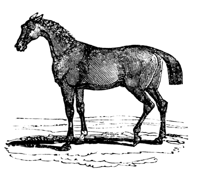 Of one of these people a touching story is told. The whole stock of a poor Arabian of the desert was a mare, and he consented to sell her to a French merchant for a very 13large sum of money. At length with only a miserable rag to cover his body he brought his noble courser to the house of the buyer. Having dismounted, he looked first at the gold and then at the mare, and heaving a deep sigh, he exclaimed, “To whom is it that I am going to give thee up? To Frenchmen, who will tie thee close, who will beat thee, who will render thee miserable! Return with me my beauty! my jewel! and rejoice the hearts of my children!” Having said this he sprang on her back, and was out of sight in a moment. Still, for a continuance of great exertion, the English Race Horse is said to be superior to the Arabian, and for fleetness, he will yield to none. A Race Horse will go at the rate of a mile in less than two minutes.