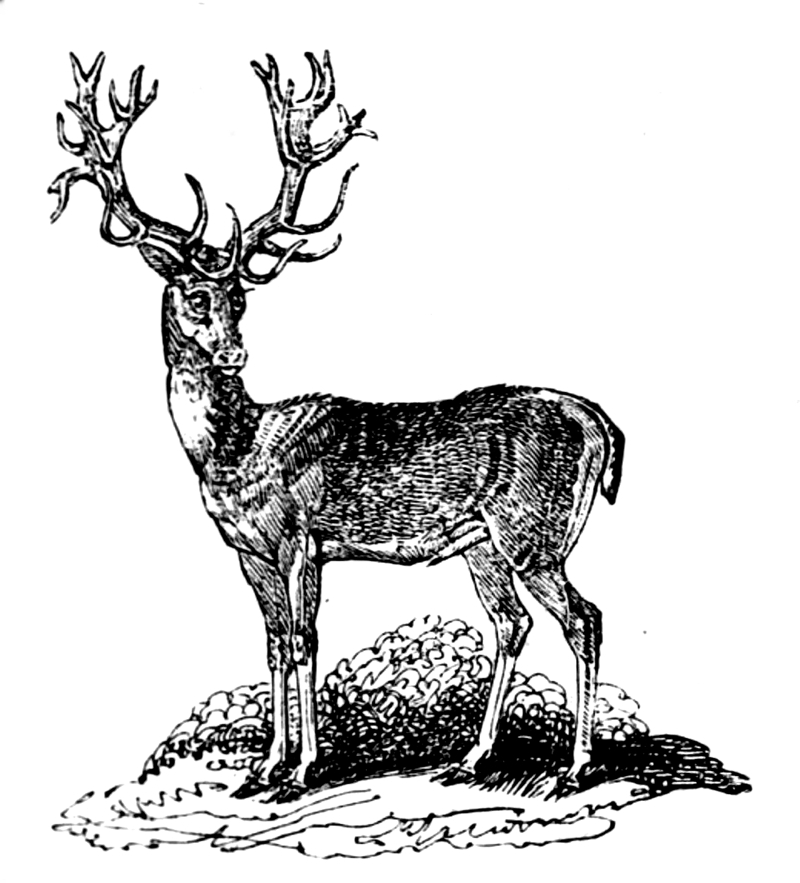 This is the most beautiful animal of the Deer kind. The elegance of his form, the lightness of his motions, the flexibility of his limbs, his bold branching horns, which are yearly renewed, his grandeur, strength and swiftness, give him a decided rank over every other inhabitant of the forest. The age of the Stag is known by its horns: he begins to shed them about the end of February or the beginning of March: each year they become larger.